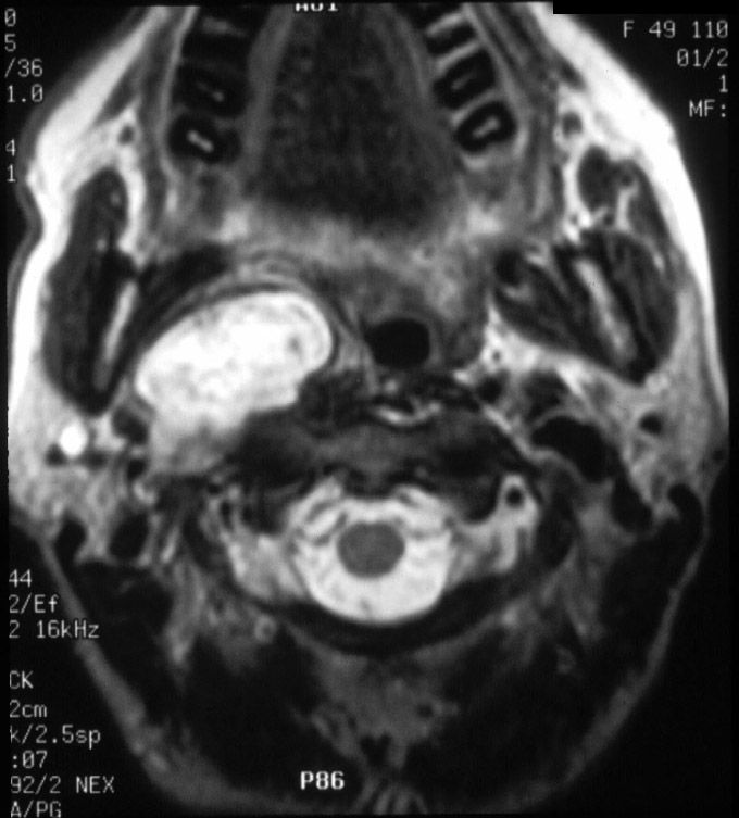Axial MRI illustrates a right parapharyngeal space lesion.