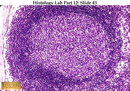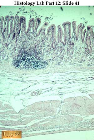 This slide shows an isolated, single primary lymph nodule in the wall of the stomach stained dark purple because of the small lymphocyte accumulation. Such nodules are often found in the wall of tracts that exit to the outside and represent a first line of defense against foreign substances that might enter the body via these routes. Nodules like this in the GI tract are thought to be one source of B-type lymphocytes producing IgA antibodies.
