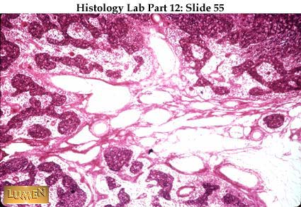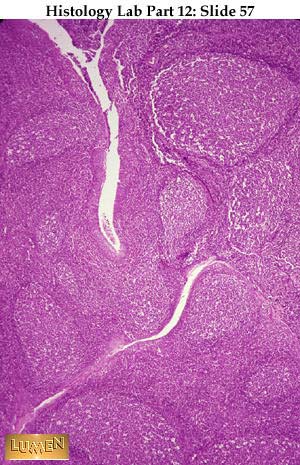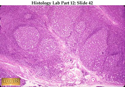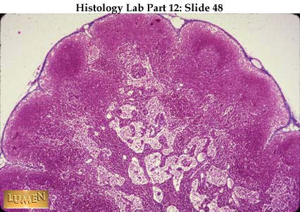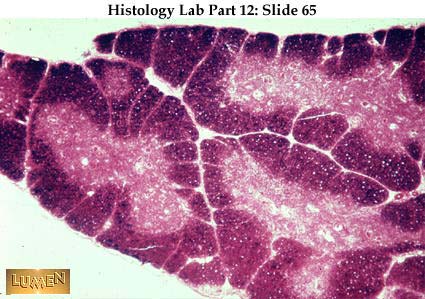 Panoramic view of the infant thymus, showing its lobulated structure. Within each lobule is a dark cortex and pale medulla. There are no round nodules or germinal centers in the cortex, just diffusely and densely packed lymphocytes. The thymus is seeded by lymphocytic stem cells very early in life and is particularly active in the production of lymphocytes in the young person. Those lymphocytes which resided in the thymic cortex early in life are forever after "thymus dependent"-cells , no matter where they reside in the body later on.