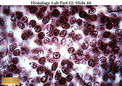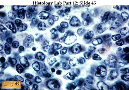 Detail of secondary nodule. The germinal center is pale because of the presence of lymphoblasts and large lymphocytes with larger, paler nuclei. The small lymphocytes typical of circulating blood, with their smaller, darker nuclei, are pushed to the rim of the nodule, as are the plasma cells differentiating in the area.