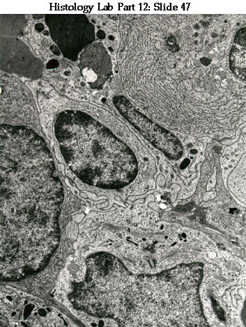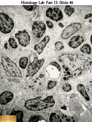 Survey EM of lymph node from a rat. 1=small lymphocytes; 2= medium-sized lymphocytes; 3= macrophage with particles in secondary lysosomes; 4= blood capillary with endothelial cell lining.