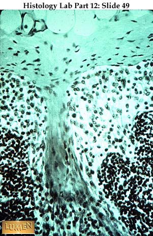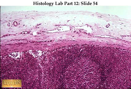 Detail of outer surface of lymph node, with pale c.t. capsule on the outside, sending an extension (trabecula) down into the substance of the node as a frame-work. Pale sinus channels can be seen lying immediately beneath the capsule (subcapsular sinus) and surrounding the trabecula (cortical or trabecular sinuses). From these superficial sinuses, lymph then flows into the deep medullary sinuses (not pictured here). Stellate reticular cells can be seen spanning the sinuses, where lymphocytes are less dense. Reticular cells support the lymphocytes of the denser lymphoid tissue as well, but are harder to see there.