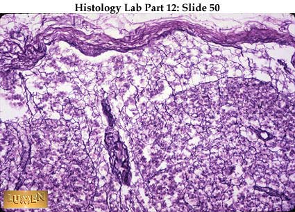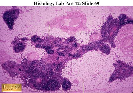 Panoramic view of adult thymus, largely replaced with adipose tissue. There are recognizable remnants of thymic lymphatic tissue, however, and Hassall's corpuscles are still present in the medulla.