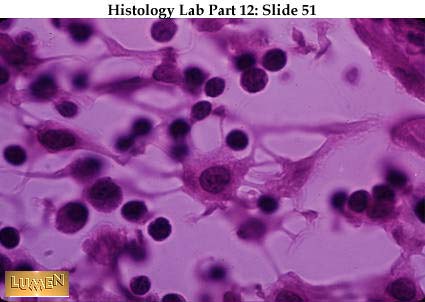 Detail of reticular cell, this one showing its stellate processes. The life history and possible functions of reticular cells have been the subject of considerable theorizing in the past, but the current work shows that they are simply supportive and produce reticular fibers. Since reticular fibers are basically thin collagen fibers, some people