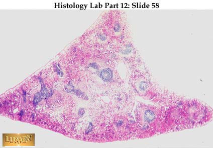 Panoramic view of spleen, staining bright pink throughout the "red pulp" because of the presence of so many filled and distended blood sinusoids. Scattered at random throughout the red pulp are aggregates of lymphocytes ("white pulp", also known as Malpighian bodies). Notice the pink structures within the white pulp. These are the central arterioles, and they are diagnostic features of the spleen. The arteriole characteristically has a very small lumen but a definite smooth muscle coat. Actually, white pulp is arranged in long "sleeves" of lymphatic tissue (PALS: periarterial lymphatic sheaths) following along the length of the arteries; here we are cutting the arteries and their sheaths in cross-section. Arteries leave the trabeculae quite early to travel through the pulp, while veins tend to remain within the trabeculae. The very large, mostly empty vessel seen here is a trabecular vein.