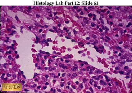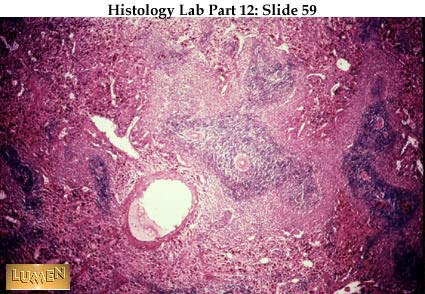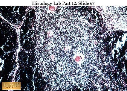 Closer examination of white pulp with two eccentrically placed "central arterioles" (quite pink here). A germinal center has formed here, displacing the artery to the edge of the area. As always, the germinal center indicates active production of plasma cells from B-lymphocytes. Helper T-cells mingle with the plasma cells at the rim of the nodule. Meanwhile, the majority of splenic T-cells reside in the non-nodular portions of the periarterial sheath immediately surrounding the central arteriole. Macrophages tend to congregate in the marginal zone between white pulp and red pulp, and here they begin to process red blood cells for possible breakdown and phagocytosis.