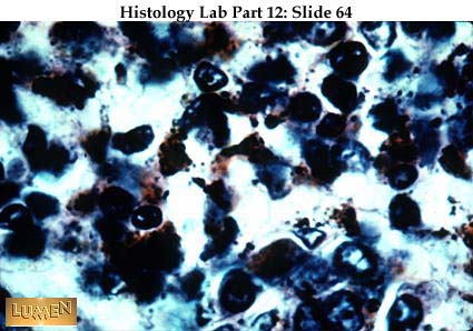 Splenic phagocytes (macrophages) loaded with yellowish-brown hemosiderin particles ingested during the breakdown of dead red blood cells. The spleen filters and "cleans" blood in the same way that the lymph nodes filter lymph.