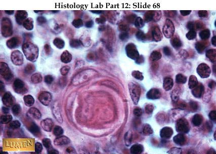 Detail of Hassall's corpuscle, with concentric layers of keratinizing epithelial cells. Although the significance of the corpuscles is uncertain, they are apparently formed from the epithelioid stromal cells.