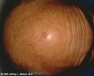 An actinic keratosis of the scalp. These lesions are often difficult to see. They