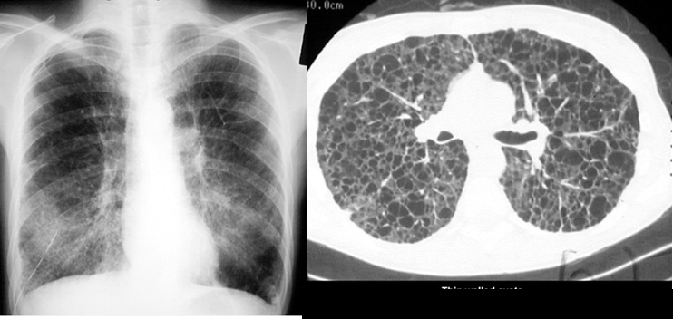 Bilateral interstitial infiltrate, with a right sided chest tube inserted for chylothorax. CT showing thin walled cyts.