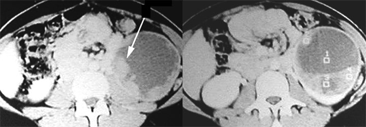 - Arrow: Solid hypodense mass left kidney