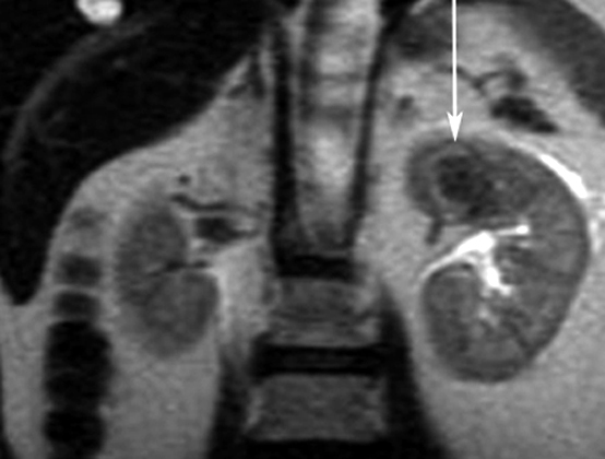 - MR: Appears hypointense as compared to renal parenchyma.
