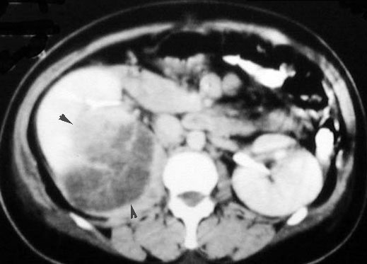 - CT is the diagnostic procedure of choice. It can provide information about the mass, perirenal extension, vascular invasion, nodal and liver involvement.