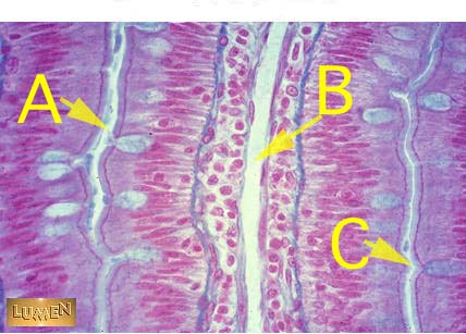 Where is the surface of the lining columnar cells, 'A', 'B', or 'C'?