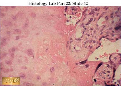 Chorionic villi, on the maternal side of the placenta at the right, are seen attaching to what structure to the left?