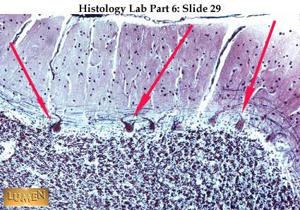 Cells at tips of the arrows are lying in between the outer and inner cortical layers of cerebellar cortex. What are they called?
