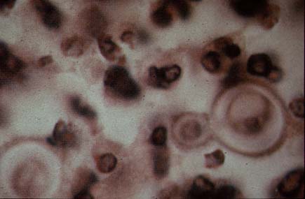 The high power microscopic section of tissue reveals a single budding yeast form.