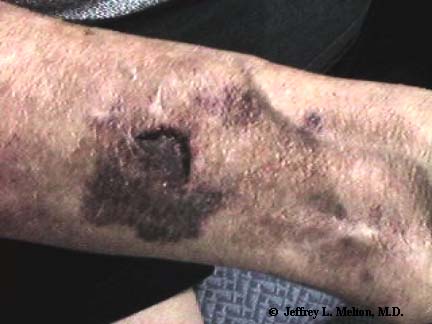 These are extremely common lesions, particularly in the elderly. They result from very minor trauma which the patient may not even remember. The one depicted here is very dark. Lesions are ecchymoses (essentially bruises), and can be any shade from blue to black, depending upon the age of the lesion. Often, many are present on each arm, the characteristic location. They heal with a whitish, irregularly shaped scar, called a stellate pseudoscar.