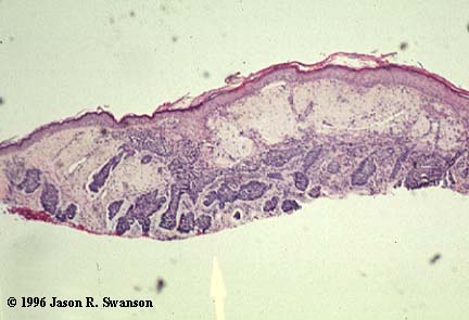 This is a photomicrograph of a shave biopsy of a basal cell carcinoma. Note the rather small, darker colored islands of tissue in the dermis.