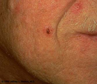 An eroded/ulcerated lesion on the cheek. Often there is a dark crust on basal cell carcinomas which results from periodic bleeding. A hint of a "pearly," somewhat translucent border may be seen.