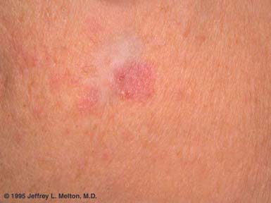 Basal cell carcinoma very rarely metastasizes. However, with standard surgical treatment, approximately 10% of BCCs recur at the site of previous treatment (although this figure is higher in certain facial sites). Clinically, the tip-off to diagnosis of a recurrence is a new pink area or papule (bump) in an old surgical scar resulting from previous treatment.
