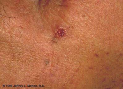 The pink papule in an old surgical scar is characteristic or recurrent BCC. The old surgical scar can be seen extending downward from the tumor. This lesion had been excised twice previously. Since basal cell carcinoma is as common (1 million/year in USA) as all other cancers combined, there are a lot of recurrences, even though the initial cure rate averages 90%. Recurrent BCCs spread in an unpredictable fashion, which results in the lower cure rate for these lesions.