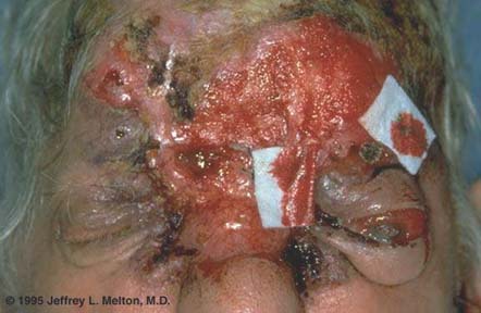 This lesion recurred after treatment and was then ignored. It has invaded the forehead, glabella, nasal root, and the orbits. The lesion is so extensive that surgical treatment would be difficult. Although basal cell carcinoma rarely metastasizes, it is locally invasive and can result in extensive destruction of tissue if not treated.