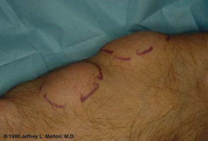 Multiple dermal/subcutaneous tumors are present on the arm. The lesions have been outlined with a surgical marker. This patient has multiple symmetric lipomatosis. Most patients with lipomas have only one or a few lesions, but this patient has many. These lesions are usually soft and somewhat mobile. They are benign.