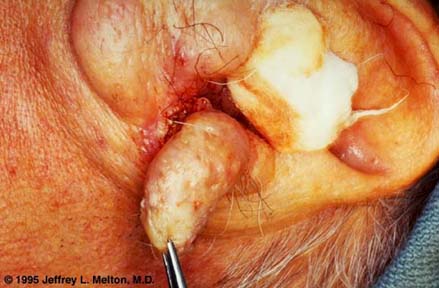 Located on the ear, otophyma is an overgrowth of sebaceous tissue analagous to rhinophyma. This otopymatous tissue on the ear is in the process of being excised.