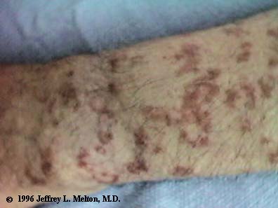 These lesions appear very similar to actinic keratoses. On biopsy, they reveal the cornoid lamellae, a histologic feature of porokeratoses. Click here for closer view. Smaller, multiple lesions on sun-exposed surfaces, such as these, are termed disseminated superficial porokeratoses. The condition is transmitted by an autosomal dominant gene.