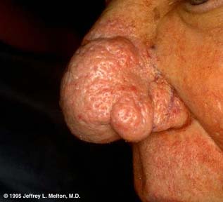 This nose has the hypertrophy of the sebaceous tissue known as rhinophyma. It results from long-standing rosacea in some patients. This condition can be treatment by a variety of sugical methods with excellent cosmetic results.