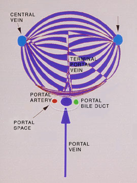 | Figure 4 - While the boundaries of the lobule are well visible,those of the acinus are unrecognizable under the microscope. Arising like a berry, a grape (latin "acinus") on the vine around the terminal portal vein,artery and bile duct, the liver simple acinus forms a mass of liver cells and sinusoids which drain toward two adjacent central veins. This structure was demonstrated by Rappaport et al.(1) by injecting dyes in the portal vein. | |