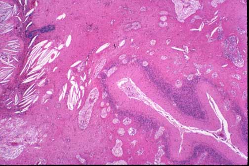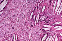 Achilles tendon. The microscopy shows massive infiltration of the tendon by cholesterol crystals.