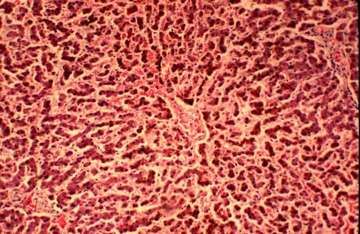 or elevation of serum alkaline phosphatase nor histological evidence of cholestasis. The hepatocytes contain an abundance of coarse dark-brown pigment similar to melanin . The liver is black but normal. Serum bilirubin ranges between 2 and 20mg/dl, 60% conjugated. Jaundice appears in the first 3 decades of life and is intermittent. Sometimes the onset is acute, simulating a hepatitis. The prognosis is excellent. The disease is inherited as autosomal recessive trait. The diagnosis is made by needle biopsy. Corriedale sheep have similar black liver disease.Click on the pictures to enlarge