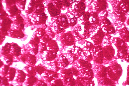autopsy material.Glycogen nuclei are very numerous and periportal in