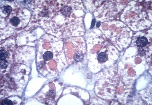 Fig 30 - ALPHA-1-ANTITRYPSIN STORAGE: The periportal hepatocytes contain very visible citoplasmic inclusions