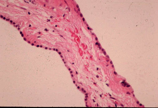 The cysts are lined bile duct epithelium which, in these cysts, it is cuboidal. There are
