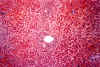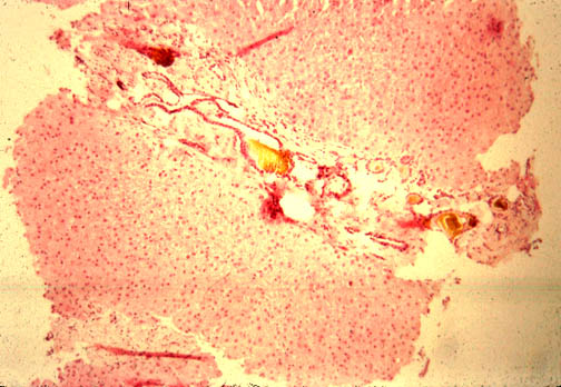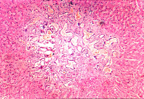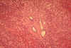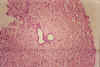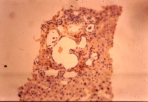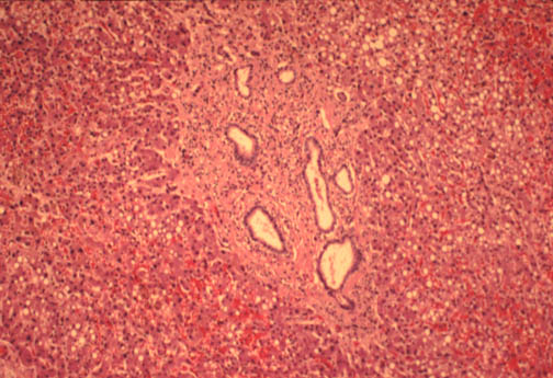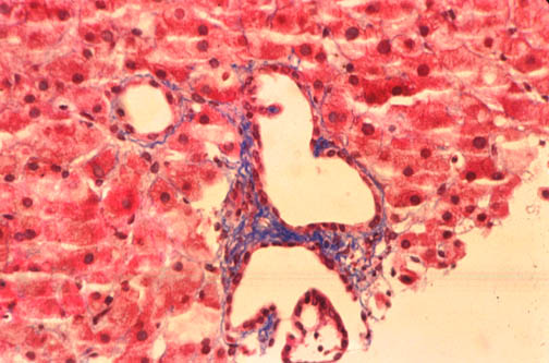 In this case you see dilated ducts and portal fibrosis. There is a combination of congenital ductal dilatation (Caroli' syndrome) and congenital hepatic fibrosis. |