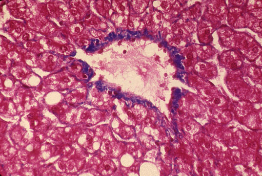 Fig 25a - From sinusoids the blood flows into the CENTRAL VEIN of the hepatic lobule. Central veins empty into larger SUBLOBULAR VEINS. These flow into larger COLLECTING VEINS which empty into the SUPRAHEPATIC VEINS which end in the INFERIOR VENA CAVA. The sinusoids empty into the central vein through large apertures. All sizes of hepatic veins do not have valves. |