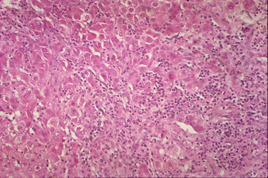 In the liver, as in every vascularized tissue, cell death (necrosis) evokes an inflammatory reaction which is morphologically manifested by the appearance of inflammatory cells together with edema and congestion around parenchymal cells which, in the case of the liver, are damaged hepatocytes or damaged bile ducts or damaged blood vessels. Therefore we talk of "HEPATITIS", "CHOLANGITIS", "VASCULITIS". Inflammation of the liver lacks the gross classical signs of swelling (tumor), reddening (rubor), pain (dolor), but< microscopically it classically shows presence of inflammatory exudate with morphologically documentable cytological and tissue changes. The type and distribution of the inflammatory exudate and the type of changes will vary sometimes according to the etiological agent. We say sometimes because, in the liver, the inflammatory reaction may not help to clearly distinguish between an hepatitis due to a chemical agent9r to an infectious agent such as a virus, e.g. it may not distinguish between a viral and a toxic hepatitis. Obviously we encounter in the live acute and chronic inflammation.