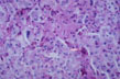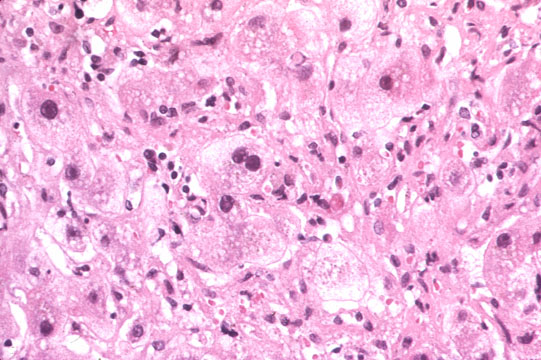 Fig 61 - "BILIARY" PIECEMEAL NECROSIS: In a case of "primary biliary cirrhosis". There are vacuolated pseudoxanthomatous cells and no peripolesis nor rosetting fibrosis. | |
