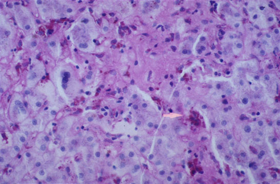 The surrounding and membrane contact between lymphocytes and hepatocyte which goes under the name of "PERIPOLESIS" is the hallmark of piecemeal necrosis. When lymphocytes penetrate a hepatocyte or any other cell, the phenomenon is called "EMPERIPOLESIS". In piecemeal necrosis the hepatocytes may become necrotic or apoptotic. Others may become hyperplastic and grow in "ROSETTES" surrounded by a rim of fibrous tissue. Ductular proliferation may occur. The portal field undergoes fibrous expansion. Periportal and periseptal necrosis of hepatocyte without peripolesis should not be diagnosed as piecemeal necrosis which is the typical lesion of chronic active hepatitis and vacuolar degeneration of chronic cholestasis. |