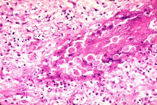It is due to Toxoplasma gondii, so-called because it was found in a rat by the name gondi in North Africa. It is acquired from raw meat and cat feces. It affects immunosuppressed individuals. It is a major intercurrent infection in cardiac and liver transplants. Fetuses are infected from the placenta and develop severe brain damage. Fluorescent antibody test for IgG and IgM are the best for diagnosis. It is readily seen in H&E sections. It is treatable.