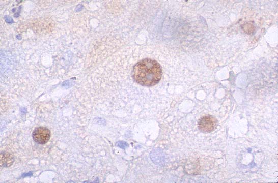 Fig.126 - Positive Immunoperoxidase reaction for HBV surface antigen. Cytoplasmic localization. |