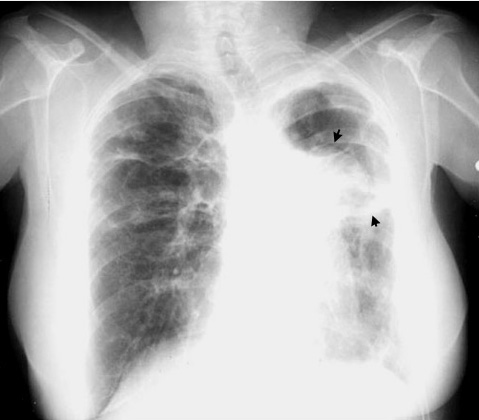 Advanced stage with upper lobe fibrosis; left pleural fibrosis and left upper lobe cavity with fungus ball.