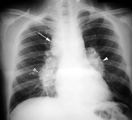 Arrowheads: Bilateral symmetrical hilar adenopathy