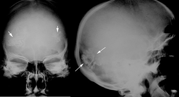 • Calcifications are in the hemangiomas in the brain.