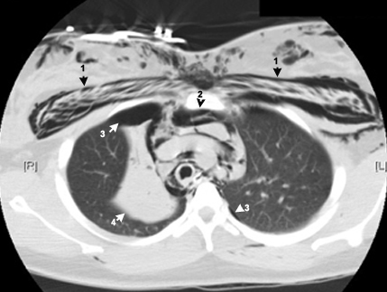 1: Subcutaneous emphysema. 2: Pneumomediastinum. 3: Pneumothorax. 4: Collapsed right upper lobe.