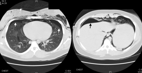Lower cuts confirmed bilateral pneumothoraces and a pneumoperitoneum.