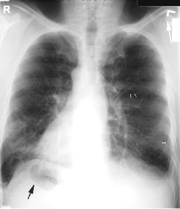 Dextrocardia. Stomach bubble on right. Surgical clips from previous lobectomy for bronchiectasis. Bronchiectasis cannot be recognized from this CXR.